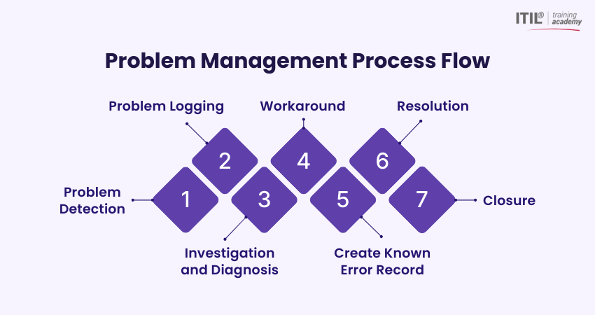 ITIL® Problem Management moves beyond fixing individual incidents and focuses on managing the entire lifecycle of a problem. Let us look at the process flow of Problem Management in detail.
