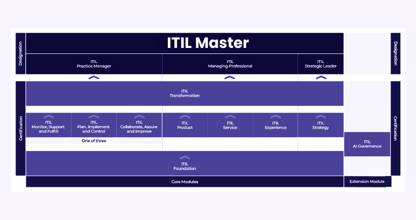 An additional AI Governance extension module supports ethical and responsible AI adoption. Achieving ITIL® Master requires completion of the Practice Manager, Managing Professional, and Strategic Leader pathways.
