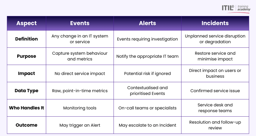 Here are the key differences between Events vs Alerts vs Incidents: