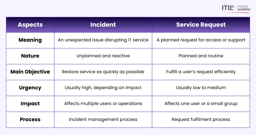 In comparison to Incidents, Service Requests typically involve low risk. They are planned activities and rarely require urgent action or escalation. This is why Incidents are prioritised based on urgency and impact, while Service Requests are usually handled on a first-come basis within agreed timeframes.