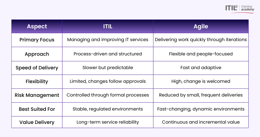The main difference between ITIL and Agile is what they focus on. ITIL is designed to manage and improve IT services in a stable and controlled way. Agile is designed to deliver work quickly and adapt to change. These different goals shape how each framework is used in practice.