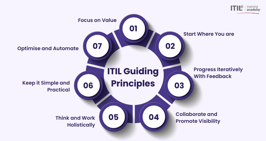 ITIL Principles focus on delivering value, improving services, collaboration, and continual improvement, supported by governance and control.