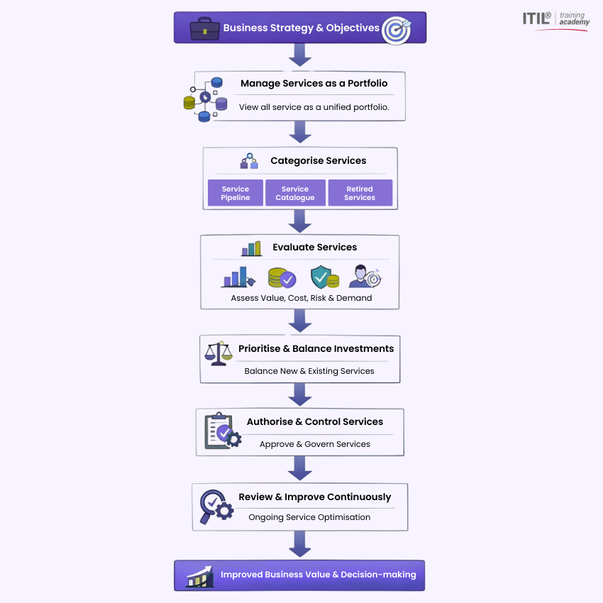 ITIL Service Portfolio Management treats all services like financial investments. Instead of managing services separately, organisations view them together to understand overall value, performance, and priorities.