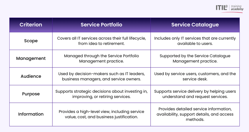 A Service Portfolio covers all services across their lifecycle to support strategic decisions, while a service catalogue lists only active, customer-facing services. The table below highlights the key differences between them.